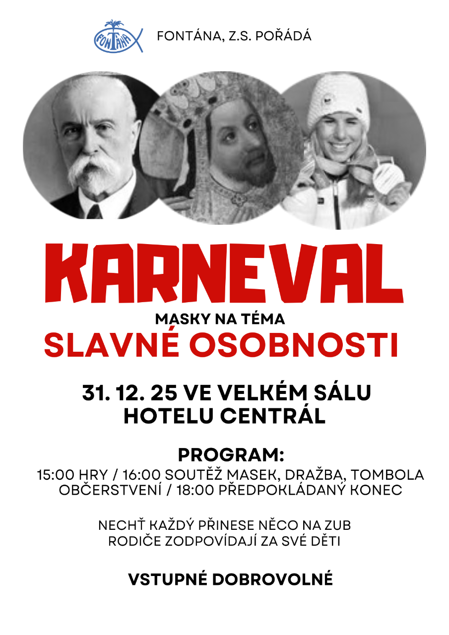 SILVESTROVSKÝ KARNEVAL 31.12.2025 15:00 ANI NA SILVESTRA NEBUĎ SÁM !!! STAŇ SE MASARYKEM, KOLUMBEM ČI CESAREM A PŘICHVÁTEJ K NÁM PĚŠKY NEBO POVOZEM.